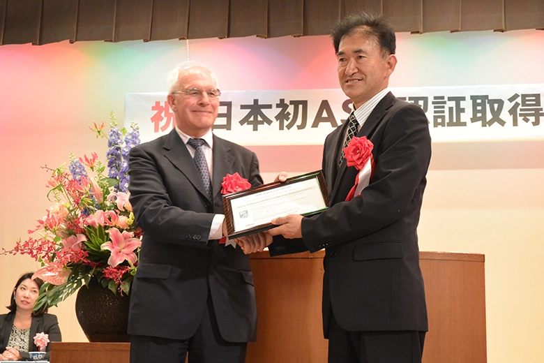 日本初のASC認証証書授賞式の様子。ASC代表のクリス・二ネス氏と戸倉かき生産部会長の後藤清弘氏