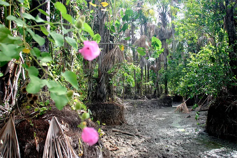 カボ・オランジ国立公園に広がる湿地林と、この地の自然を代表する水鳥の一種ベニヘラサギ。