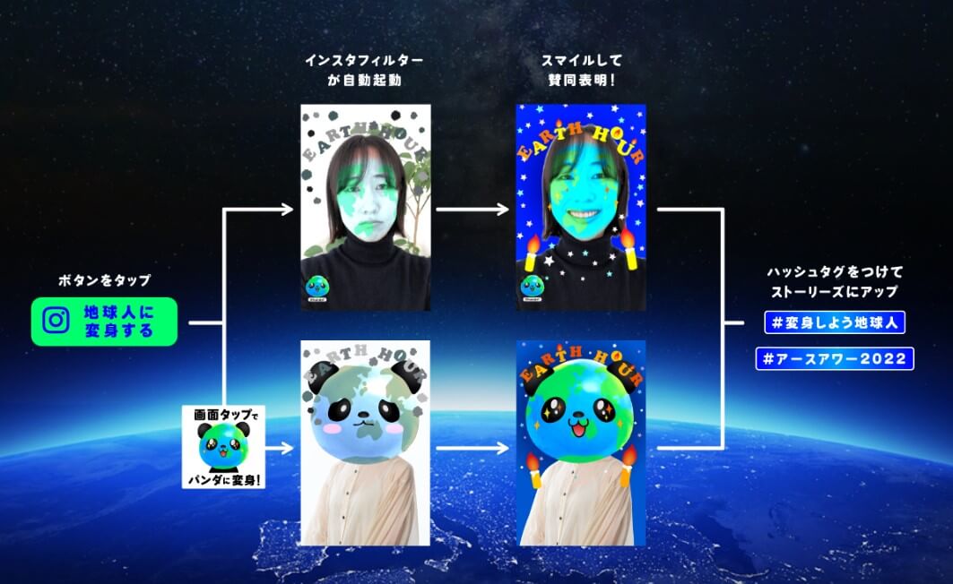 EARTH HOUR をキッカケに、地球環境の課題を「自分事」として考え、環境保全のために行動する真の地球人に変身しよう、という想いのつまったこのエフェクトは、3,000人以上の方々にご利用いただきました。