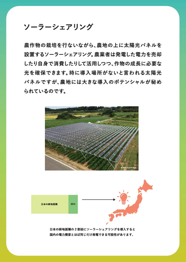 農地を活用し、農作物の生産と太陽光発電などの再生可能エネルギーの広がりを両立させる取り組み、「ソーラーシェアリング(営農型太陽光発電)」のミニチュア模型も紹介しました。