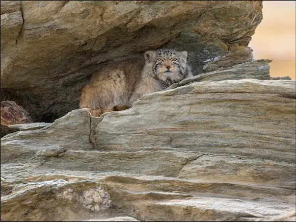 私たちは静かに車を降り、少なくとも50メートルは離れて、この貴重な瞬間を逃さないように注意した。私たちの存在に気づかず、それはそこに座っていた。その突き刺すような黄色い目は遠くを見つめていた。特徴的な涙線の縞模様に縁取られた毛の房は、年老いた不機嫌な賢者のひげ面のようだった。夕方の光がネコを黄金色に照らし、私たちは座ってその一挙手一投足を観察した。そして、太陽が水平線の下に沈むと、ネコは迷路のような岩の中に消えていった。”