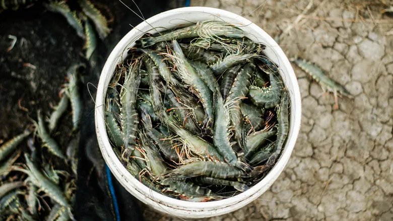 ASC認証審査員による養殖池でのエビの収穫状況の確認