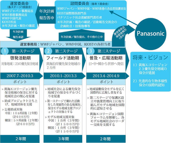 「黄海エコリージョン支援プロジェクト」は、2007年から2014年まで実施された、長期的かつ国際的な環境保全活動です。本プロジェクトは、大きく3つの段階に分けて進められました。
