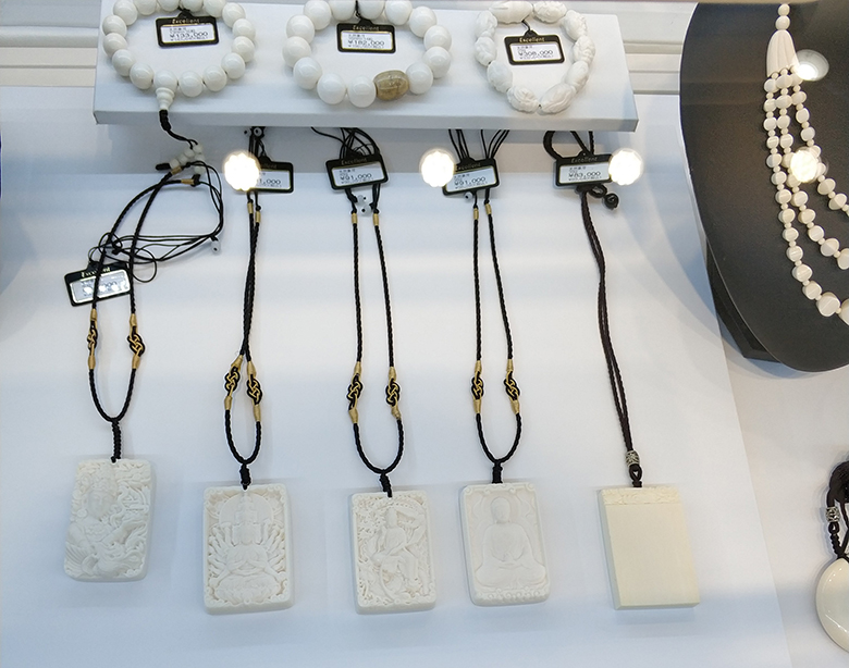 東京の有名な観光エリアである浅草で展示販売されていた、中国などの消費者に好まれるデザインの新たに製造された象牙の装身具図