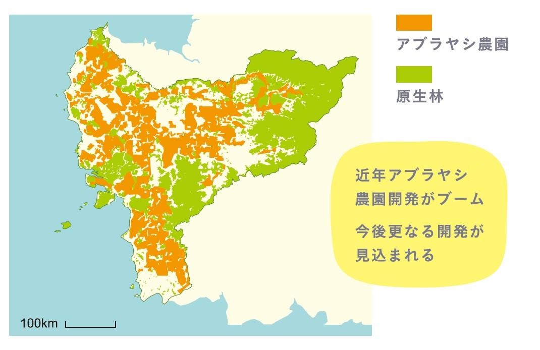 かつて島全体が原生林に覆われていたボルネオ島。島の西端に位置する西カリマンタン州では、近年アブラヤシ農園の開発ブームが起きています。ここでも、オランウータンなどの野生生物にとってすみかとなる、生物多様性が豊かな原生林が、急速にアブラヤシ農園に切り替えられてしまう問題が生じてきました。