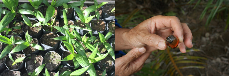 左:国の研究機関の認定を受けた生産性が高いアブラヤシの苗。企業はこうした苗を利用する。右:小規模農家が認定を受けたと騙されて購入した苗からできた実。果房が実るまで3年かかったが、実が菌に感染したため、売り物になっていない。