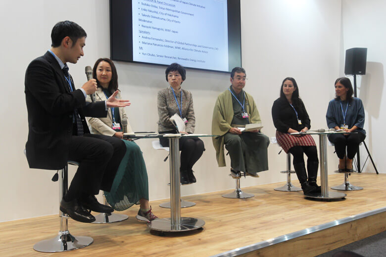 今回もジャパンパビリオンにおいて、日本から東京都、横浜市、京都市の参加を得て、日本の非国家アクターもすでに排出ゼロに向けてさまざまな取り組みを行なっていることを紹介しました。