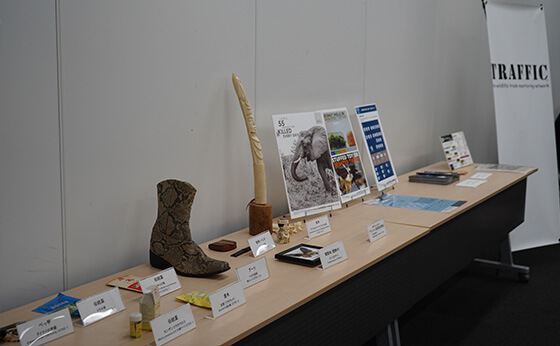 実際に水際で差し止められた野生生物由来製品の展示(啓発用に経済産業省よりお借りしているもの)