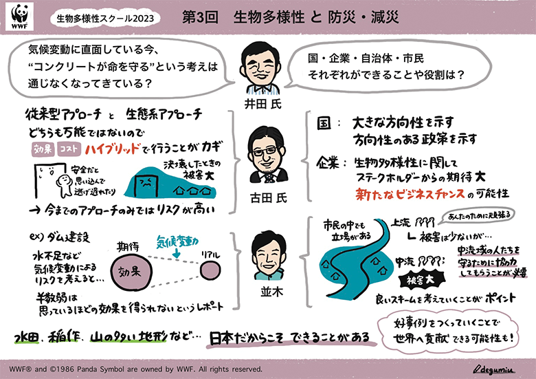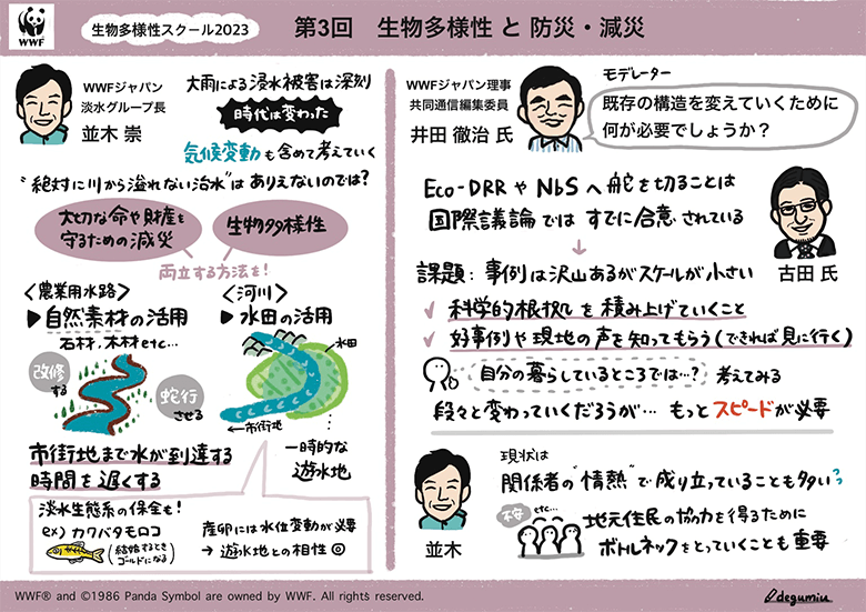 このたび、この分野で日本を代表する、大正大学教授でIUCN日本リエゾンオフィス・コーディネーターの古田尚也氏をお招きし、最新の知見や取り組みについてお伺いしました。またWWFジャパンからは、九州北西部での洪水リスクの低減と生物多様性保全の両立を目指した、田んぼや河川等に関するプロジェクトを紹介しました。スクールのポイントをグラフィックレコーディング(グラレコ)を使ってお伝えします。(グラレコ制作:aini 出口未由羽さん)