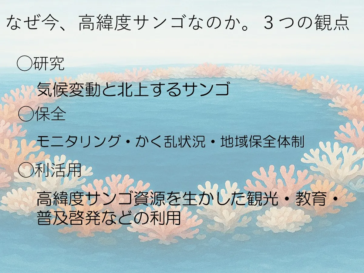 - 高緯度サンゴ群集域の近代史の解説:1930年代・旧帝国大学東北大学のグループによる広域調査、1980年代・沿岸開発によるサンゴ埋め立て問題、2000年代・気候変動の影響顕在化と環境省による保全行動計画等。