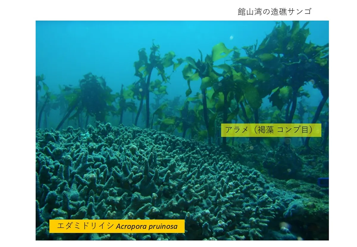 近年、地球温暖化による海水温の上昇等の影響で、クシハダミドリイシやスギノキミドリイシといったサンゴ礁域(熱帯域)を代表する種が高緯度サンゴ群集域へと分布を拡大していることが分かっています。