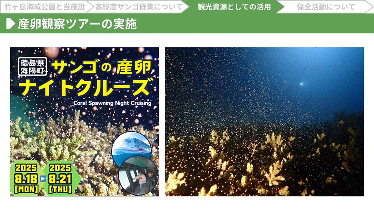 - 2019年からサンゴ産卵のナイトクルーズを企画・実施。冬場はサンゴを特殊な光で照らしたライトアップ夜間運航も実施。ツアーの背景には保全活動があり、保全活動を通じて見た感動的な海中での産卵を多くの人に見ていただきたいと思い、企画に至った。