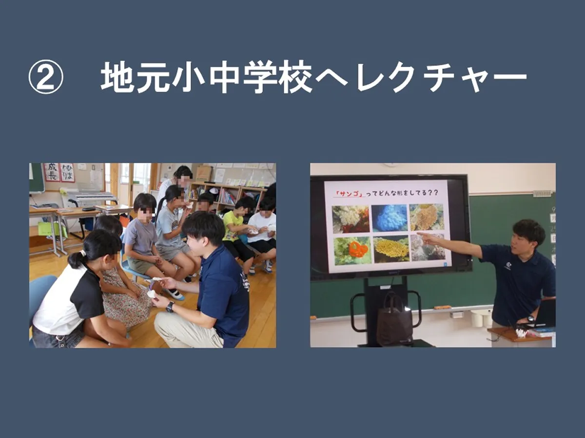 - 啓発活動は、地元小学生向けのサンゴ観察会と、サンゴをテーマとする一般市民向けの展示会の開催。海に潜ってサンゴを観察したり、普段見ることのない海中の様子をパネル展示や標本で見られる貴重な機会となっている。
