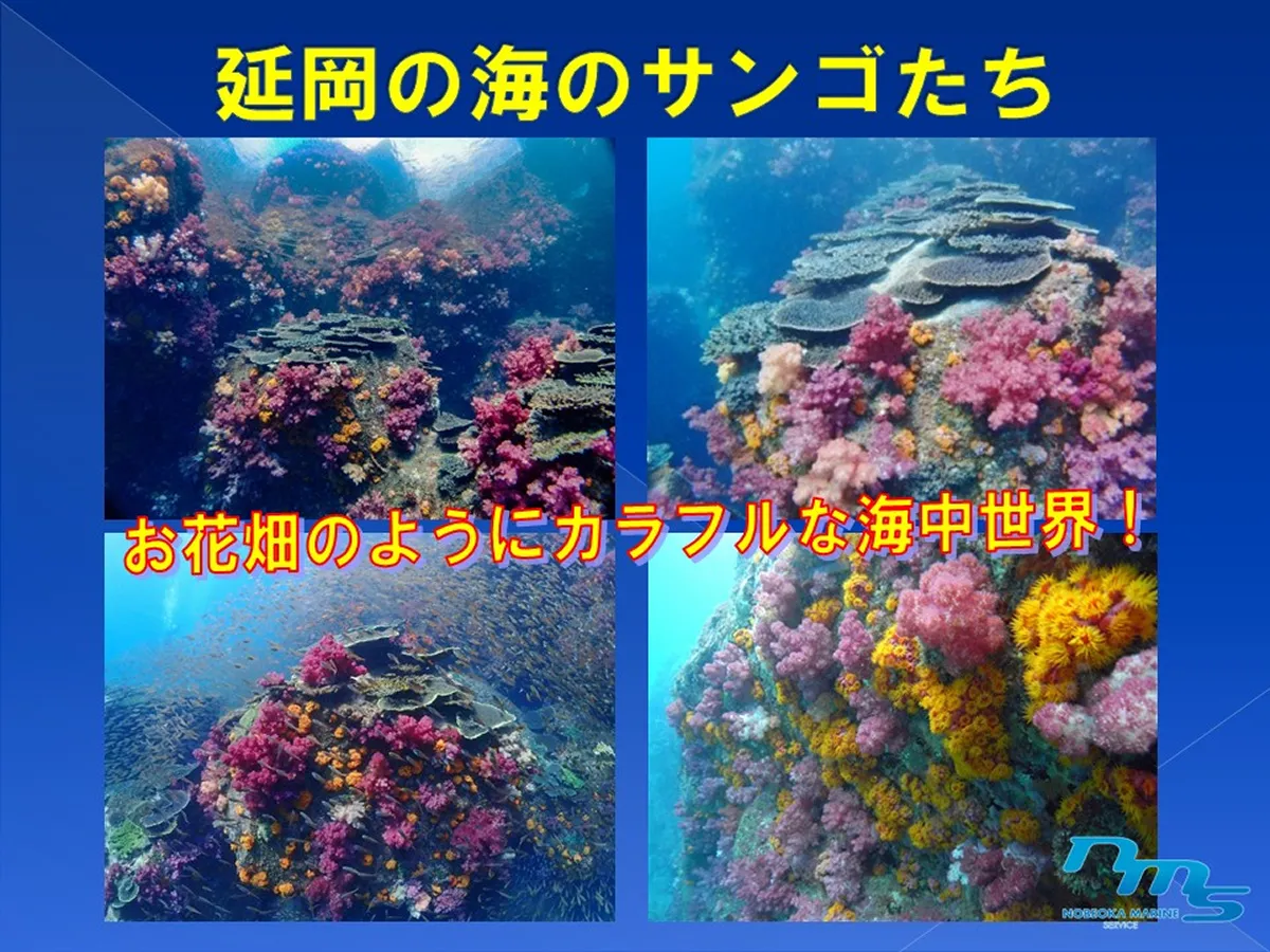 - 延岡市の沿岸海域はサンゴを見るダイビングに適している。直径2mを超えるタイハイミドリイシやエンタクミドリイシが多く約100種のサンゴが生息。長い年月をかけて成長し、一度壊れると再生に数十年かかるため、保全が重要。40~50年前は、オオスリバチサンゴ大群生地の近辺はミドリイシ等を含めたサンゴの広がりが素晴らしかった。1980年頃から養殖業の影響で周辺のミドリイシ等が徐々に弱って死んでしまい群体が崩れたことで、オオスリバチサンゴが露になっている。