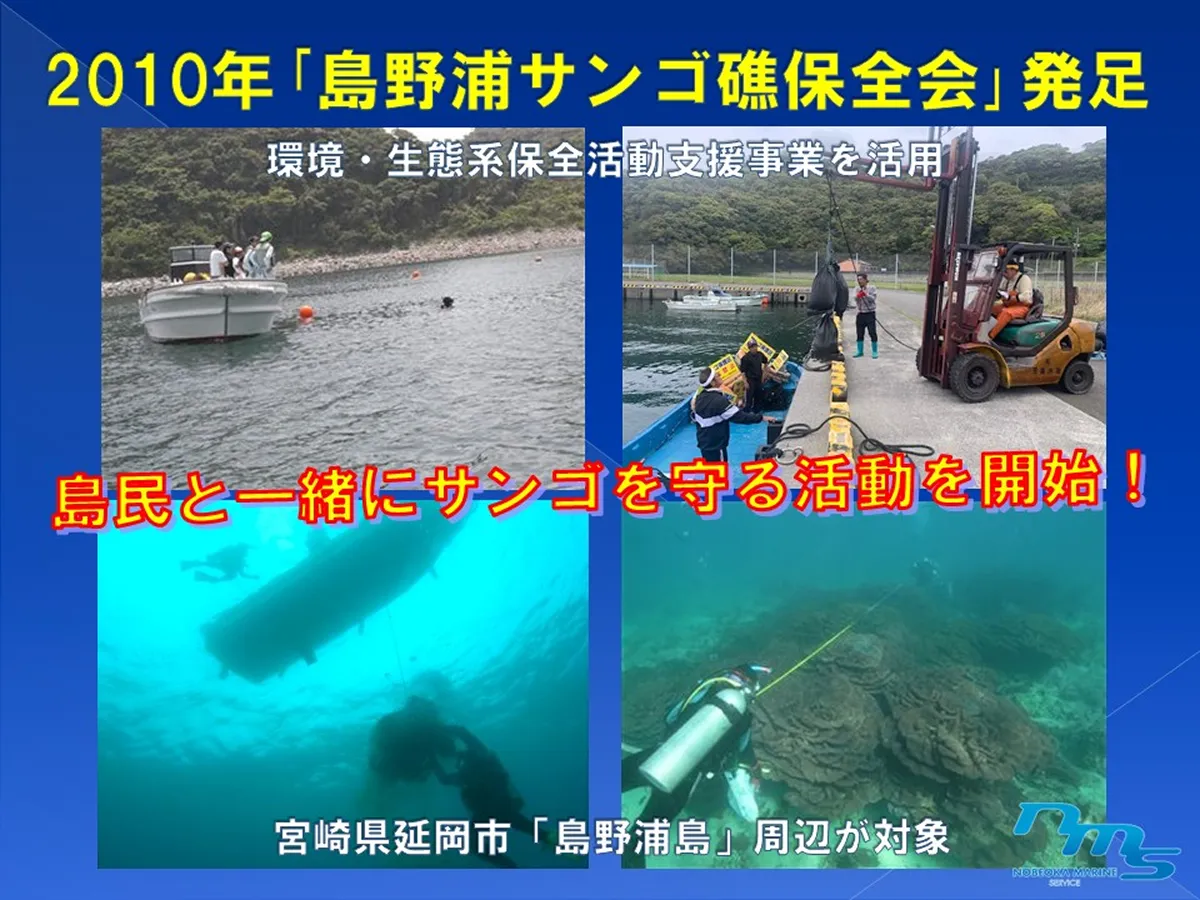- ビーチクリーンや海底清掃は40年以上継続。有害生物の駆除や地元小学校での環境学習を行うほか、2010年には島野浦サンゴ礁保全会を発足し島民と共にサンゴ保全に取り組んでいる。