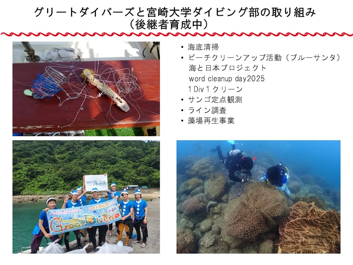 - 2024年度からは、オニヒトデ駆除、モニタリング、啓発活動に関して新たな活動方針を設け活動。オニヒトデ駆除は、ダイビング事業と両立できる期間を選び、宮崎県スキューバーダイビング安全対策協議会や宮崎大学の学生、漁業者の参加を得ながら実施。駆除したオニヒトデを肥料として資源活用することを念頭に駆除方法を工夫している。