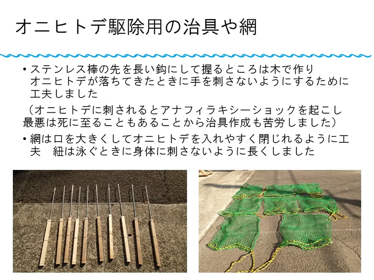 - オニヒトデの大量発生を抑制するうえでも保全活動の継続が重要で、従事できるダイバーの育成に取り組んでいる。観光資源でもあるサンゴを守るため、地域住民や漁業者、メディアへの発信を強化している。漁業者の反対によりオニヒトデが増えているにも関わらず駆除活動ができない場所があり、関係者との対話を続けていく。