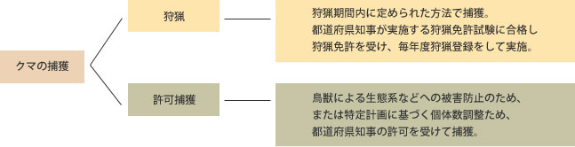 日本に生息する2種のクマは、法律によって狩猟鳥獣に選定されているため「狩猟」が行なわれ、その他に「許可捕獲」が行なわれています。