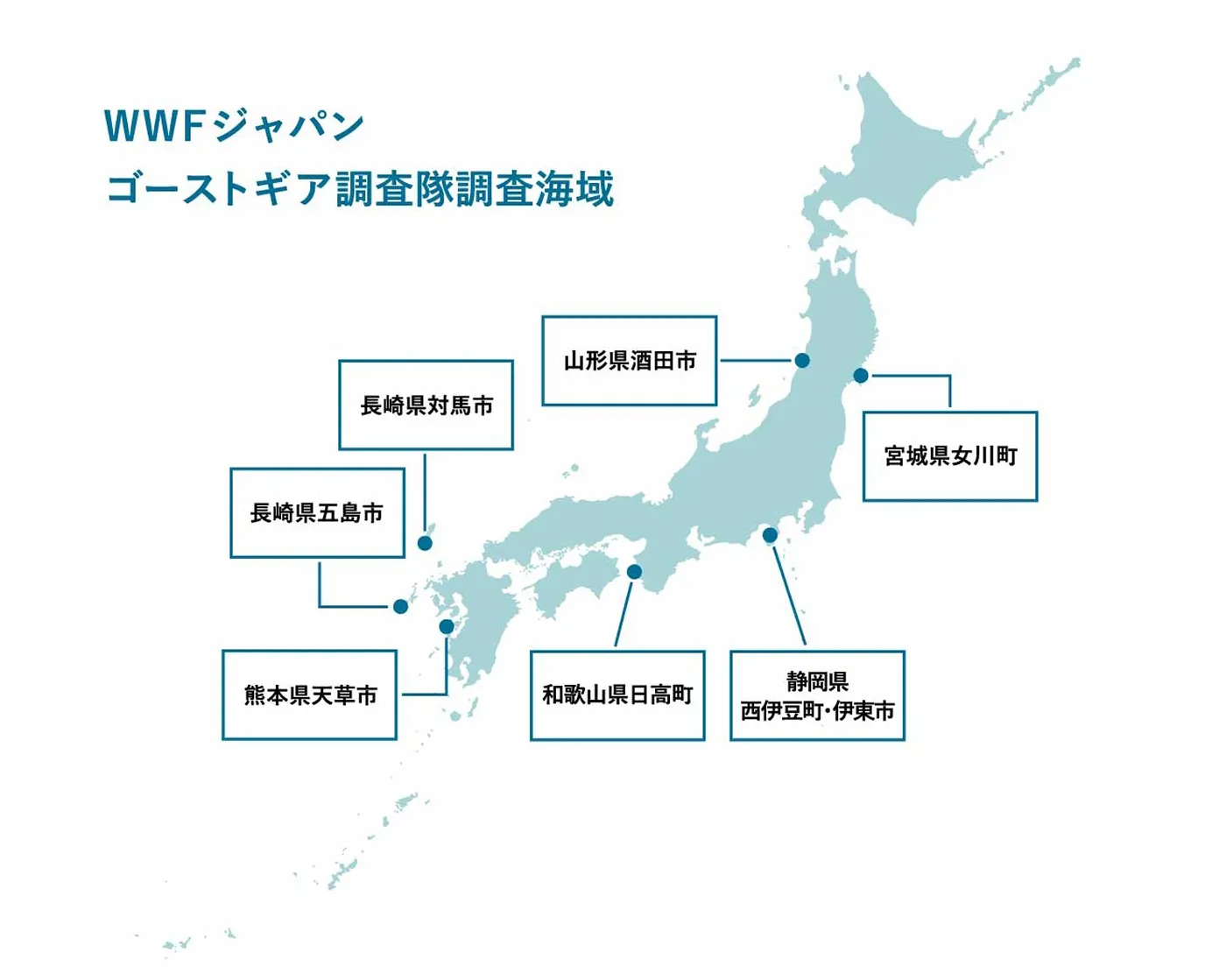 WWFジャパンは、日本近海で海域の特性や漁法などを考慮し、以下の全国7地域を選定して、活動を進めています。2023年7月から2026年9月まで、各地域で6-8回の調査を行なったうえで、回収作業も検討します。2026年夏に、ゴーストギア調査隊について全体の活動をまとめて、報告書を作成する計画です。