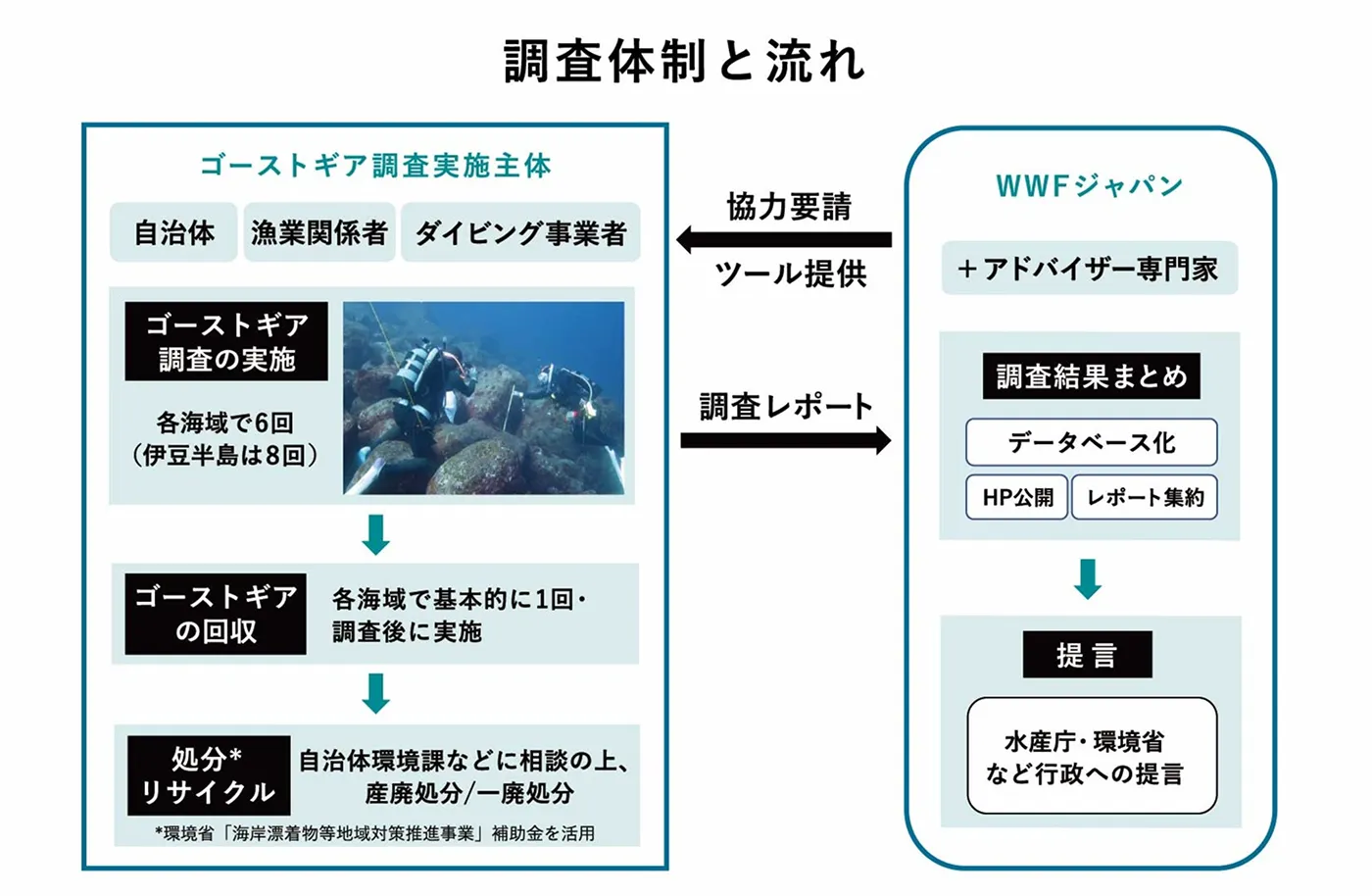 WWFジャパンは、各地域で自治体、漁業協同組合の了承を得たうえで、ダイビング事業者に委託してゴーストギア調査隊の活動を実施します。各地域で基本的に6回の調査を行なった後、調査で発見したゴーストギアを適宜回収し、処分します。WWFジャパンは、外部のアドバイザーや専門家の協力を得ながら、各地域で関係者と協議し、調査結果をまとめる予定です。全7地域での調査が全て完了した後は、得られた情報や知見をもとに水産庁や環境省など行政への提言を予定しています。
