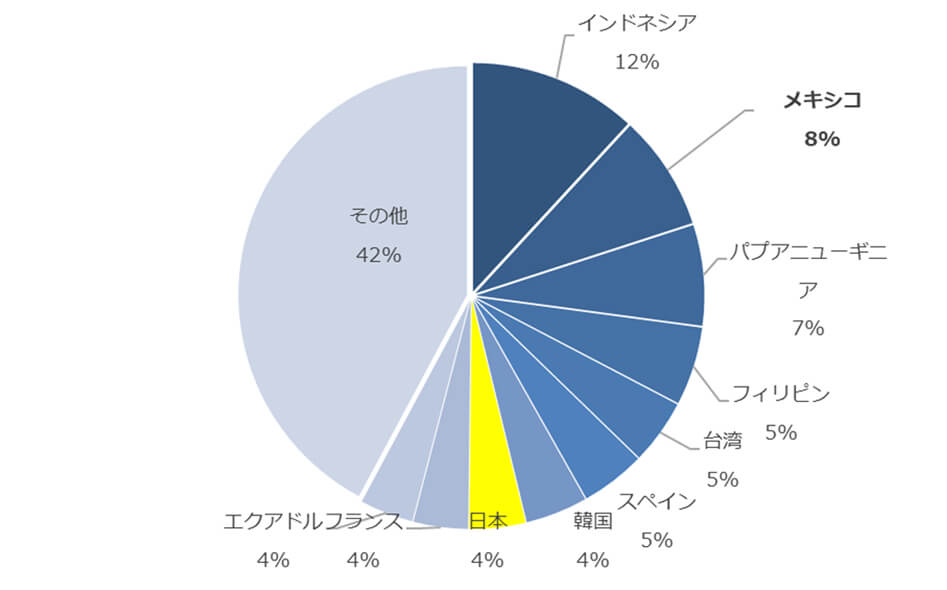 世界の漁獲量(2015-18平均)は、約12,000トンであり、日本、メキシコ、台湾、韓国、アメリカ、台湾の順で多く漁獲しています(図4)。