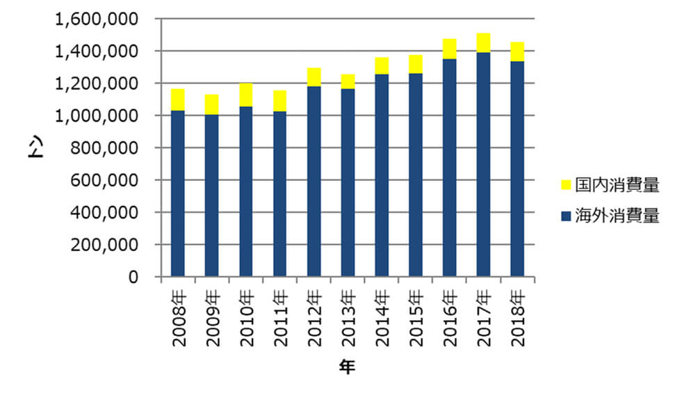 世界のメバチ消費量はほぼ横ばいであるのに対し、日本の消費量はほぼ微減傾向にあり、約11万トン、世界の消費量の29%を占めています。
