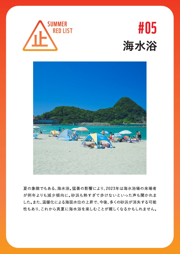 - 「夏祭り」「海水浴」「真夏の高校野球」「屋外プール」「野外フェス」など、夏から連想される風物詩が、気候変動に起因する猛暑や豪雨などの影響で、その姿を変えつつあります。これからの日本のエネルギー政策が決まろうとする今、夏の風物詩をきっかけに地球温暖化について考え、再生可能エネルギーを求める来場者の声を集める展示会「夏の風物”止”展」を、2024年8月15日(木)~8月18日(日)の4日間、渋谷ヒカリエ(東京都)で開催しました。
