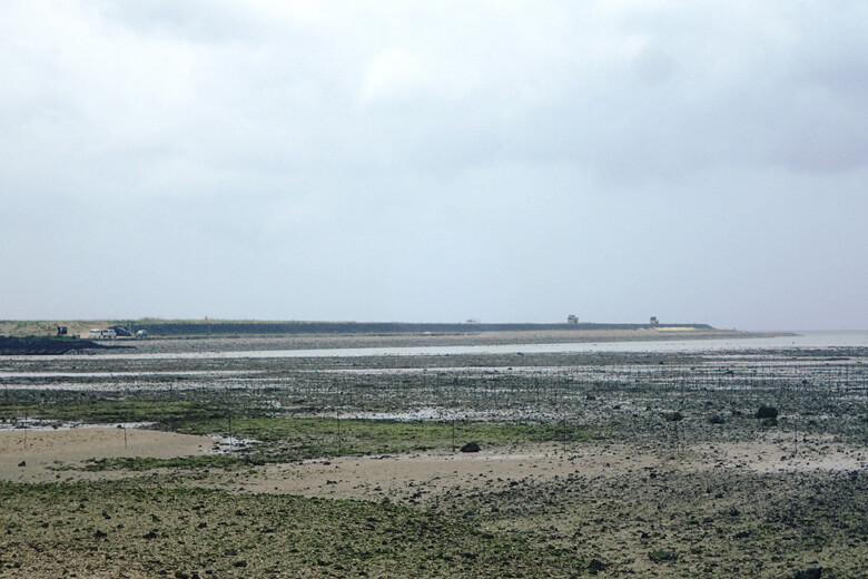 当初の計画よりも狭い面積にはなったものの、干潟の中央には巨大なコンクリートの囲いが設けられ、その周囲には、残された干潟が広がっている状態です。