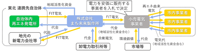 連携先自治体の発電所からの電力の調達、入札方式で決定した小売電気事業者への電力の販売、連携先自治体への地域活性化資金の還元などの一連の業務は、横浜市と連携協定を結んだ「株式会社まち未来製作所」が行なっている。まち未来製作所が調達した電力は、連携先自治体の新電力会社に優先的に販売するなど、エネルギーの地産地消にも貢献が可能。