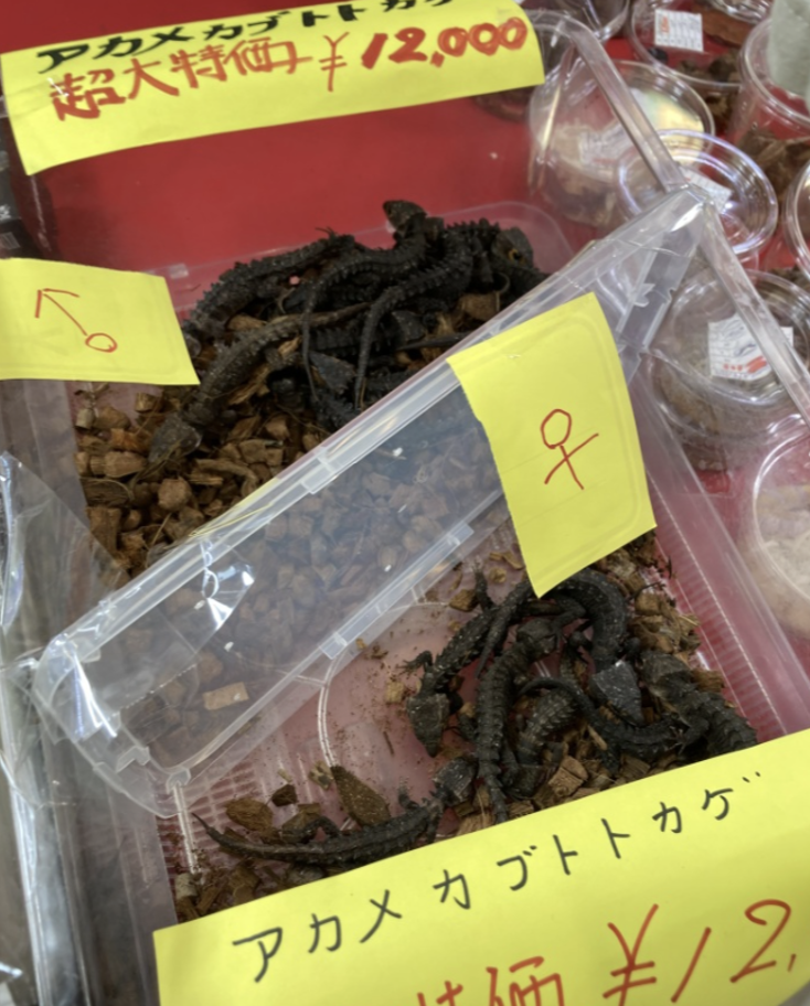 飼育下繫殖の技術は確立していないため市場では野生個体が多く流通しているアカメカブトトカゲ。過剰捕獲が懸念されている。