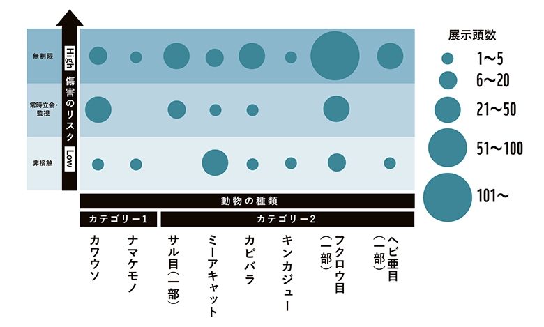 ※5 ハイリスク危険動物群のうち、1個体でも無制限の接触が確認された場合には、当該施設において常時立会・監視および非接触展示の実施はないと評価し、記録しました。