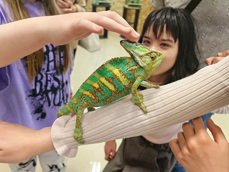 野生動物カフェでは、爬虫類や鳥類など異なる種類の動物を同じ空間で飼育しています。