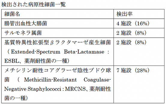 ・微生物調査により、複数の施設から病原性細菌が検出されました。