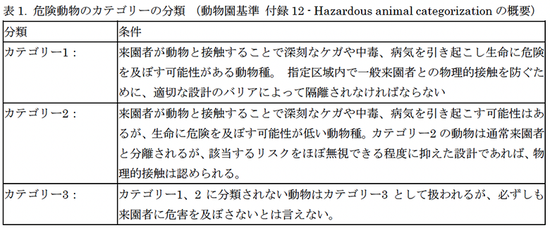イギリスでは動物園基準において、動物を「どう猛さ」「人に害を加える能力」「危害を与えた場合の被害の大きさ」の3つのリスクタイプに分類し、各タイプの危害の大きさと頻度から3つのカテゴリーに動物を分類したリストを作成しています(表1)。