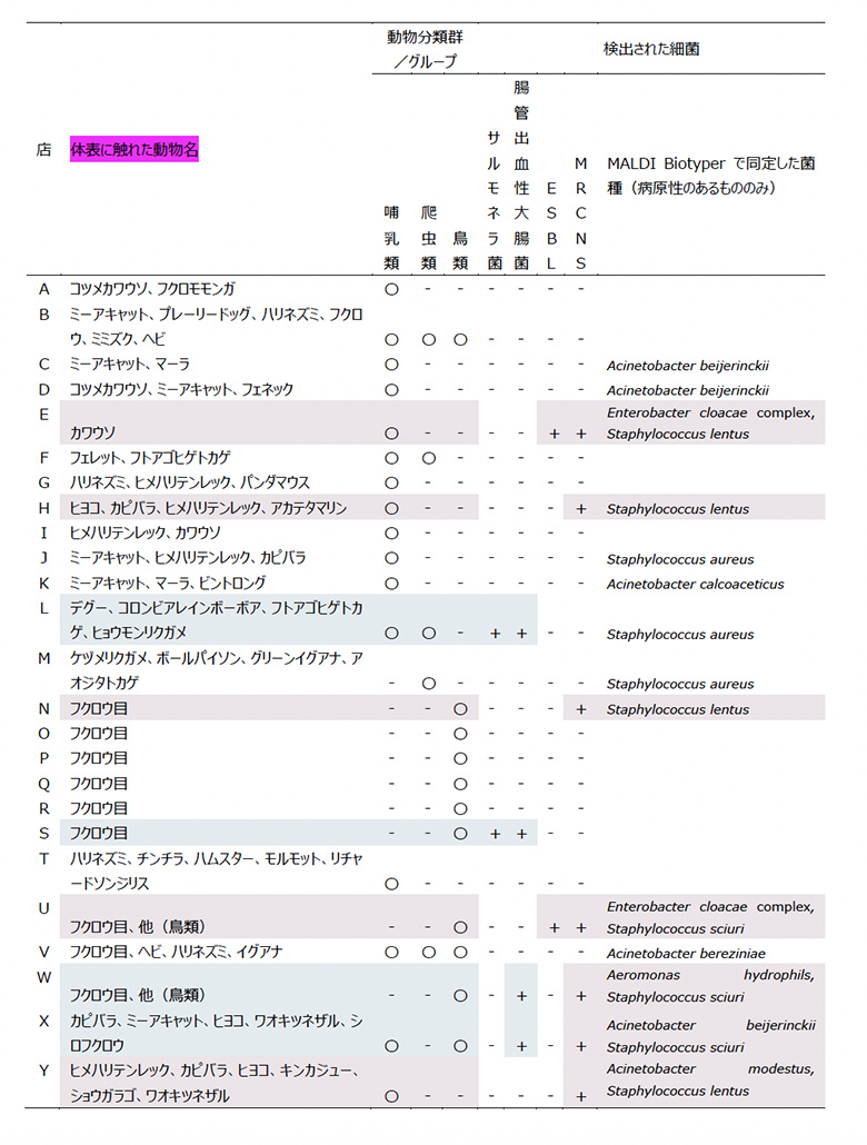 動物との接触によって得たサンプルを分析した結果、複数のサンプルから腸管出血性大腸菌、サルモネラ属菌、薬剤耐性菌が検出されました(表2)。