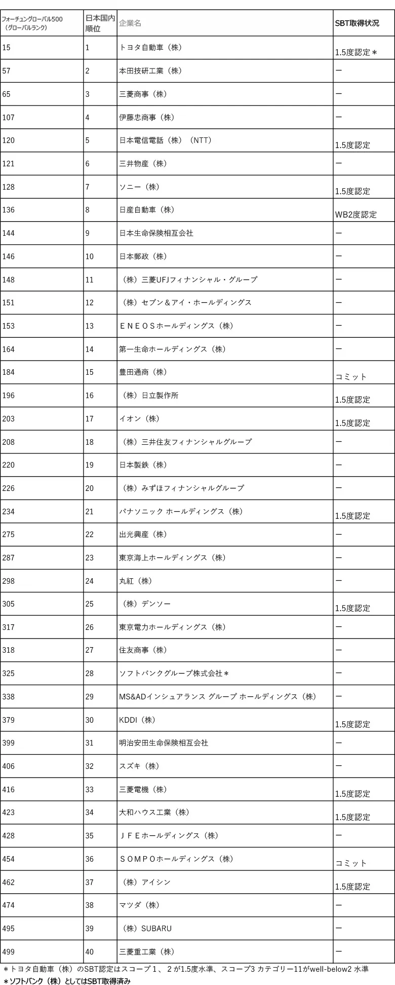 表:フォーチュングローバル500ランクインの日本企業のSBT取得状況。