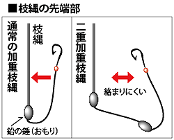 「加重枝縄は、60グラムの鉛の錘(おもり)を一つ、枝縄の先のほうに付けた構造になっています。