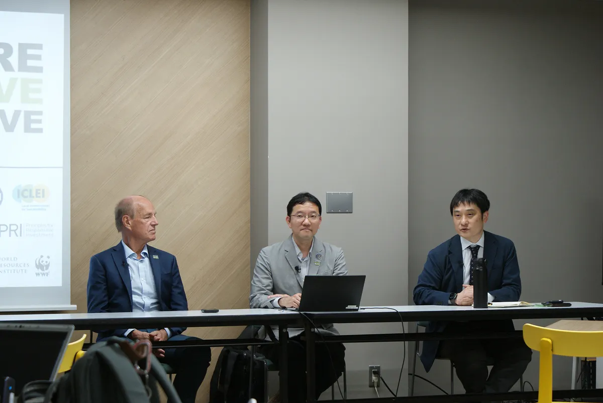 2026年4月16日WWFジャパン事務所にて、NPIとIUCN日本委員会が7月に熊本で主催する「グローバル・ネイチャーポジティブ・サミット」の記者向けレクチャーを開催。(左)NPI主宰・マルコ・ランベルティーニ氏;(中)IUCN日本委員会会長・道家哲平氏;(右)WWFジャパン自然保護室長・山岸尚之。