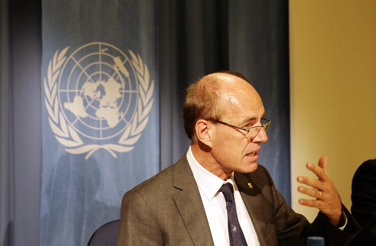 2014年、ジュネーブの国連で行われた記者会見においてWWFの『生きている地球レポート』を発表したランベルティーニ氏(WWFインターナショナル事務局長在任時)。2年に1度公表される同レポートの最新版(2024年)では、1970年以降、世界の野生生物個体群の規模が平均で約73%減少したことが示されている。