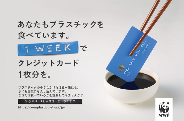 2019年6月、WWFは海洋プラスチック問題に関する国際キャンペーン「Your Plastic Diet ~毎日プラスチックを食べています~」を開始しました。ウェブサイトを中心に、「あなたも1週間にクレジットカード1枚分のプラスチックを食べています」と呼びかけるショートフィルムを配信し、海洋プラスチック汚染を解決する国際的な協定の設立に賛同するインターネット署名も集めています。