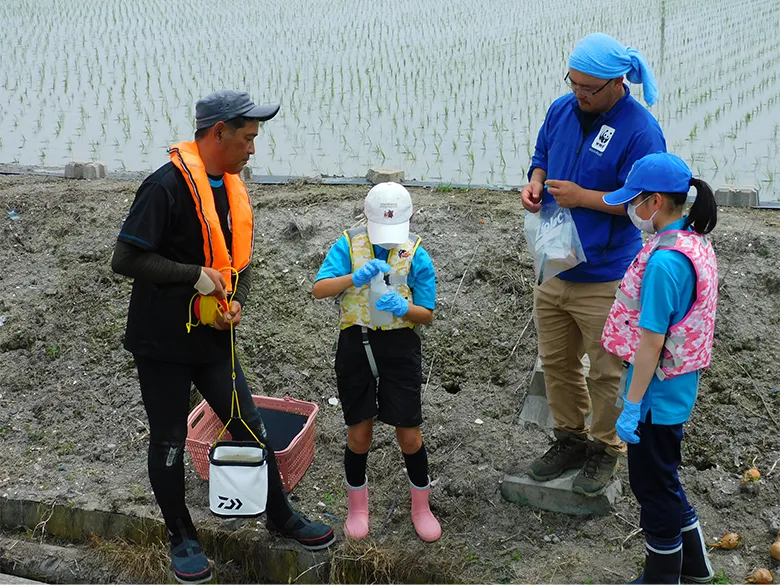 当日は九州大学の鬼倉徳雄先生のご指導のもと、佐賀市内で環境保全活動に取り組む「ラムサールクラブ」の小中学生の皆さんや、「シギの恩返し米」生産農家の方々が参加。採取したサンプルは九州大学で分析し、特に希少な2種の淡水魚、カワバタモロコとニッポンバラタナゴの保全に役立てていく予定です。