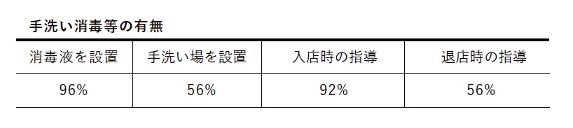 表1 :消毒や手洗い場の設置状況、および従業員による指導