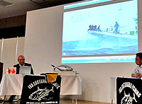 また、同社の取り組みの目玉ともいえる、カツオ標識放流調査の模様を追った、貴重な映像も放映され、これには会場の参加者も興味津々。身を乗り出して解説に聞き入っていました。