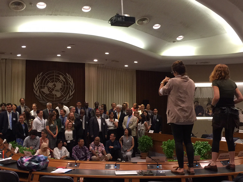 前進した論点の会議では、各国代表団が議長と一緒に記念写真に納まる姿も見られ、和やかでした