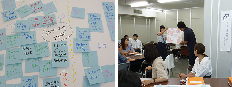 2050年の地球をイメージするアクティビティ「ウェビング」(左)。「ウェビング」は班ごとに多様な意見が出て盛り上がりました。