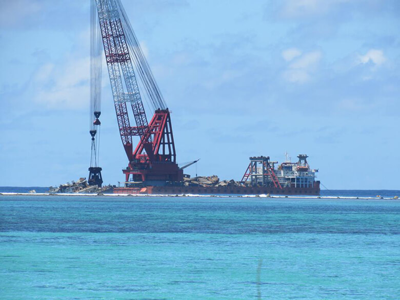 撤去作業の遅れにより、今も座礁地点に残っている船体が潮の満ち引きでサンゴ礁のリーフを削り取っていると考えられます。