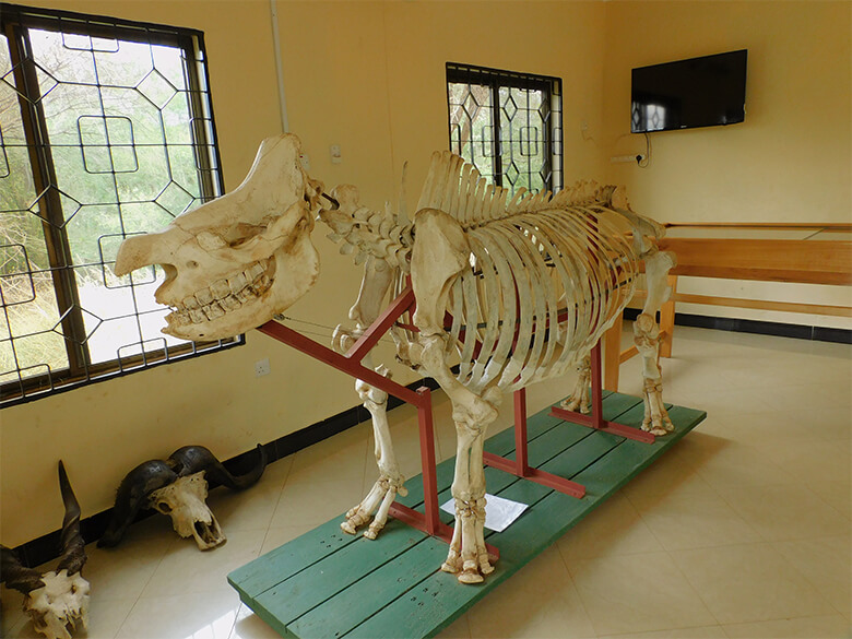 ムコマジ国立公園の景色と、かつてこの公園に生息していたというクロサイの骨格標本。クロサイはよみがえるだろうか。