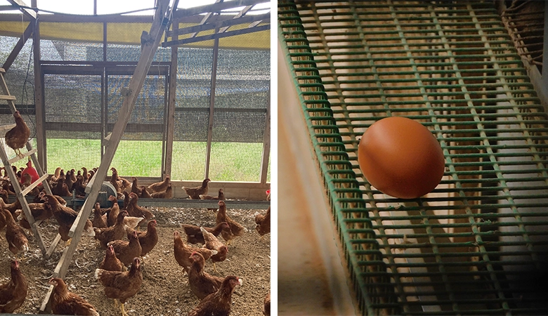 「歩荷」の鶏たち。約3,600羽が飼われています。ニワトリ本来の習性さながらに、高い場所に設けられた止まり木にも飛び上がり、自由に歩き回っています。鶏舎の間には中庭があり、そこも鶏たちの野外スペースになっています。