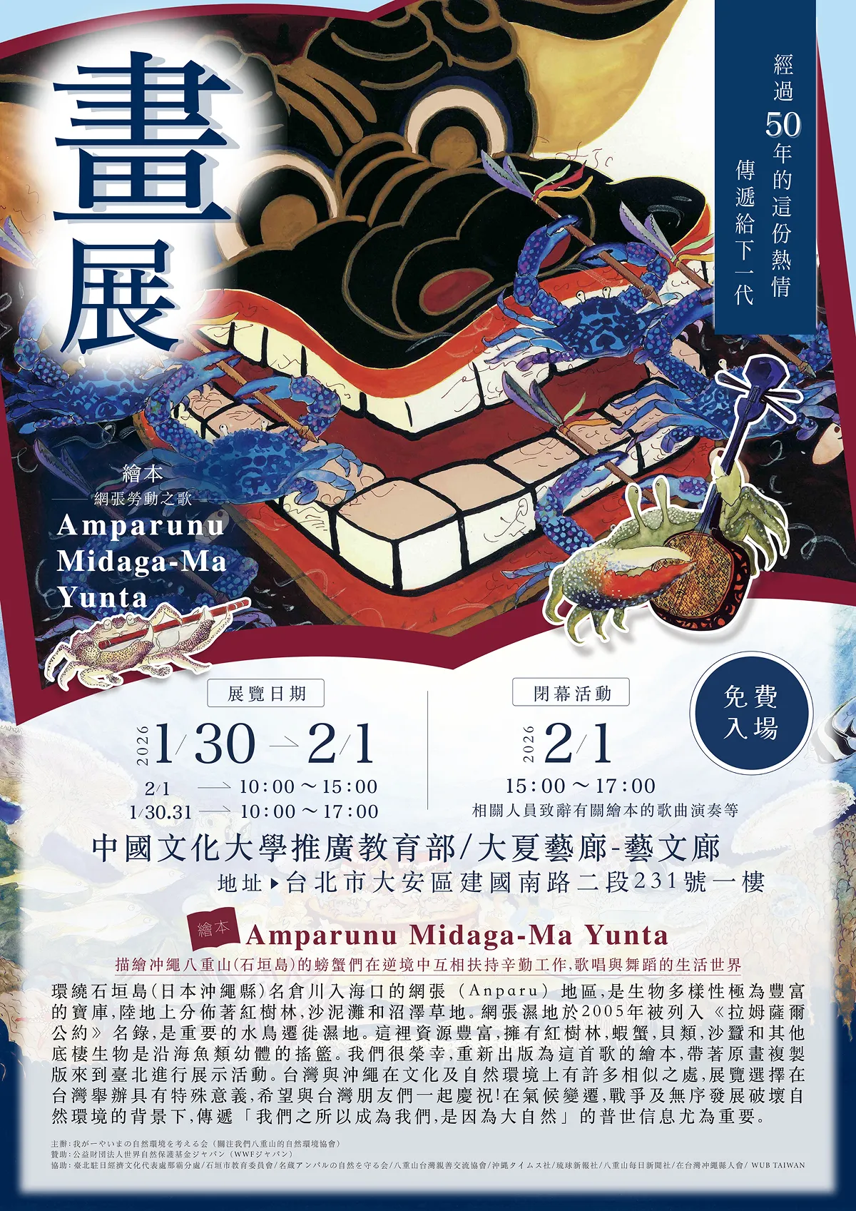 会場では、絵本の展示・販売(台湾語の翻訳付き)、講演、音楽演奏、朗読が予定され、主催・後援団体、中国文化大学、台湾海洋生物博物館の皆さんと共にWWFも登壇し、名蔵アンパルの生物多様性とそれを保全することの重要性について発表します。