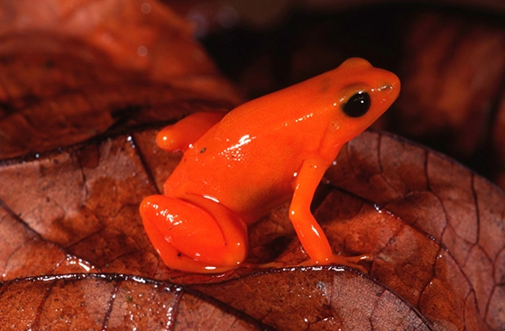 マダガスカル島固有種のキンイロアデガエル(Mantella aurantiaca)。森林破壊などで個体数が減少しています。IUCNレッドリストで絶滅危惧種(EN)に指定されています。